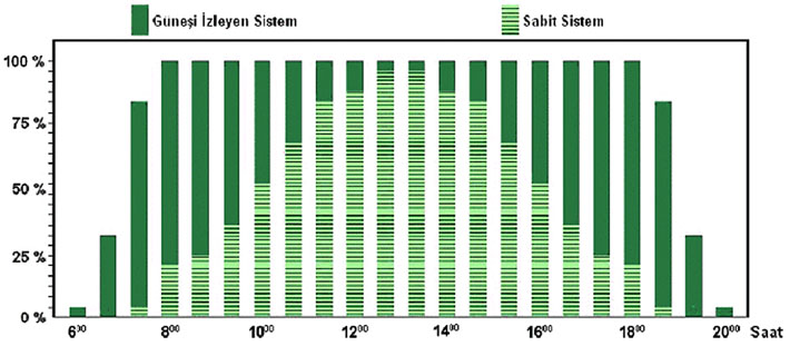 Grafikte taralı olarak gösterilen alanlar sabit altyapılı sistemin, dolu olarak gösterilen alanlar ise güneş takipli altyapıya sahip sistemin verim değerlerini göstermektedir. Grafikte, sabit altyapılı sistemin üretim yapmadığı veya düşük kapasitede üretim yaptığı sabah saatleri ile öğleden sonraki saatlerde, güneş takipli sistemin tam kapasitede çalıştığı, dolayısı ile sulama pompasının 08:00 ile 18:00 saatleri arasında tam kapasitede su çekeceği net şekilde görülmektedir. Firmamız söz konusu Güneş Takipli Altyapı Sisteminin tüm parçalarını kendi tesislerimizde üreterek, çok ekonomik bir şekilde üreticilerimizin kullanımına sunmaya başlamıştır.