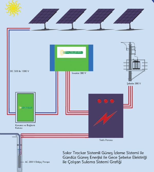 Sulama için kurulan güneş enerji sistemlerinde elektrik üreten panellerin, sabit sistem altyapıların üzerine yerleştirilmesi, enerjinin gün içinde değişken olmasına sebep olmaktadır. Bu yüzden su kuyuları için DC akım ile çalışan pompalar geliştirilmiştir. Ancak bu pompaların klasik pompalardan 2-3 kat pahalı olması ve servis ağının yaygın olmaması, bu pompaların yaygınlaşmasına engel olmuştur. Son zamanlarda geliştirilen özel motor sürücüleri klasik pompaların güneş enerjisinde kullanılmasını sağlasa da suyun aynı debide teminini sağlayamamıştır.Şirketimiz, sayılan sorunları ortadan kaldırmak ve kurulan güneş enerji sistemlerinin maksimum verimde çalışmasını sağlamak amacı bir sistem geliştirmiştir. Bu sistemde, güneş panellerinin yerleştirildiği altyapı sistemi gün içinde güneşi takip ederek, güneş panellerinin sürekli tam kapasitede ışık almasını sağlamakta ve sabit altyapılı güneş enerji sistemlerinin çalışmadığı veya düşük kapasitede çalıştığı saatlerde tam verimde çalışarak, sulama pompalarının daha uzun süre ve tam kapasitede çalışmasını sağlamaktadır. Aşağıda verilen grafikte, sabit altyapılı sistem ile güneş takipli sistemin verim değerleri görülmektedir.